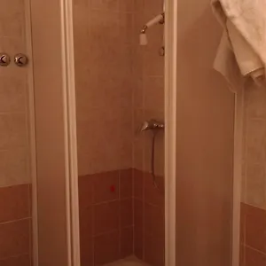 Inoltre c'è una vasca da bagno e una cabina doccia, oltre a comfort come asciugacapelli e articoli da toeletta.